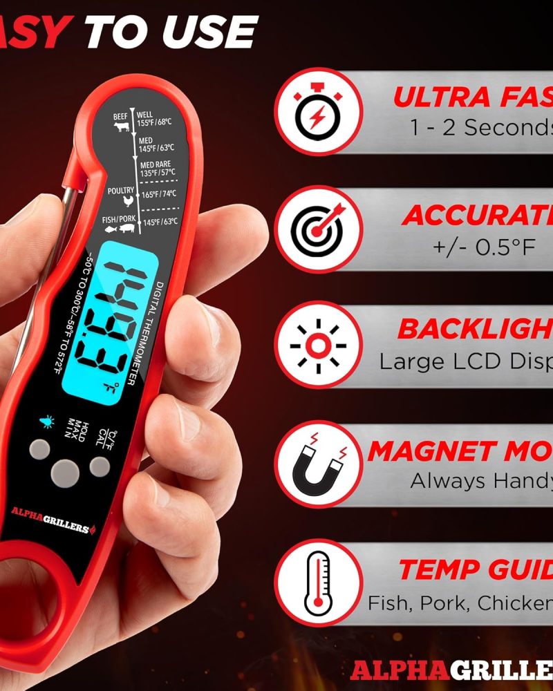 - Easy-Read Digital Thermometer For Cooking | Large instant thermometer dial with bright blue backlight means you can always read the temperature, whether you are grilling in the dark or baking in your kitchen. Perfect must have grilling accessory for kitchen essentials.