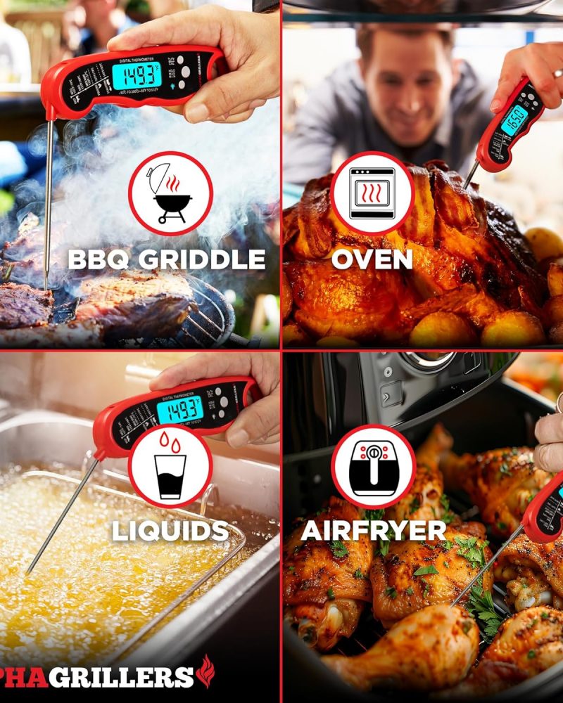 - Multi-Use | From bbq thermometer to baking thermometer, our digital food thermometer for cooking is perfect for meats, liquids, deep frying and candy making. For Air fryer, oven, grill, BBQ, Griddle, smoker, kitchen and outdoors.