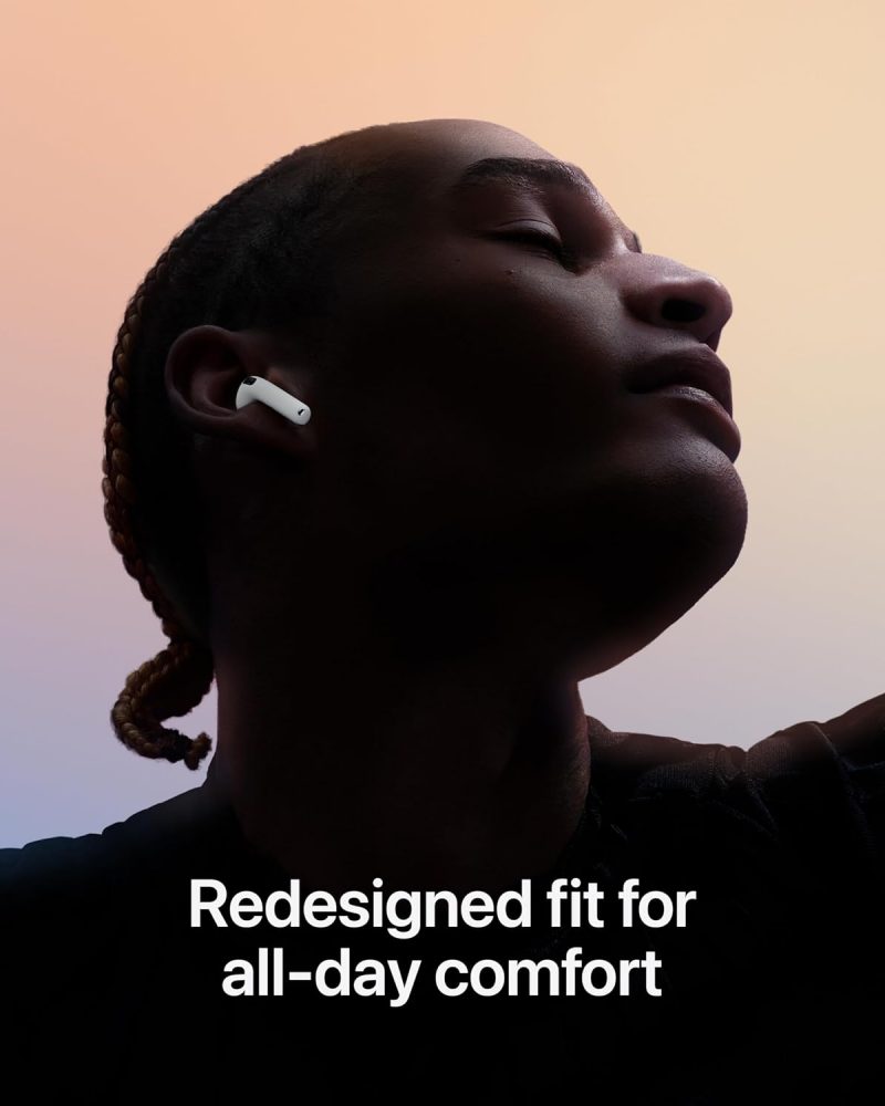 REBUILT FOR COMFORT — AirPods 4 have been redesigned for exceptional all-day comfort and greater stability. With a refined contour, shorter stem, and quick-press controls for music or calls.