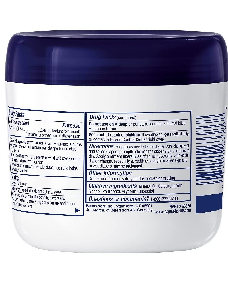 Aquaphor Baby Healing Ointment Advanced Therapy Skin Protectant is designed specifically to suit the sensitive skin of babies. Different from a baby lotion or baby cream, this dry skin ointment is water-free and retains the skin’s moisture to create an ideal healing environment. The unique formula uses 41% Petrolatum (skin protectant) to create a protective barrier on the skin to allow the flow of oxygen. Aquaphor Baby Healing Ointment nourishes and protects baby’s skin to enhance healing from skin irritations, such as painful chapped skin from teething and the sting of drool rash. This Aquaphor Healing Ointment soothes dry, chapped or cracked skin and helps prevent chafing. A great alternative to a diaper rash cream, this ointment protects the skin from wetness, acidity and chafing to help avoid rashes. Parents can also use the ointment to soften dry hands and cuticles, cracked heels or chapped elbows and lips. This diaper rash ointment is hypoallergenic, preservative and fragrance free to treat the sensitive skin of babies. Aquaphor is a pediatrician recommended brand and is a multipurpose solution for your baby’s many skincare needs. Each of the ingredients in Aquaphor skin care products are tested and approved for their quality and safety.