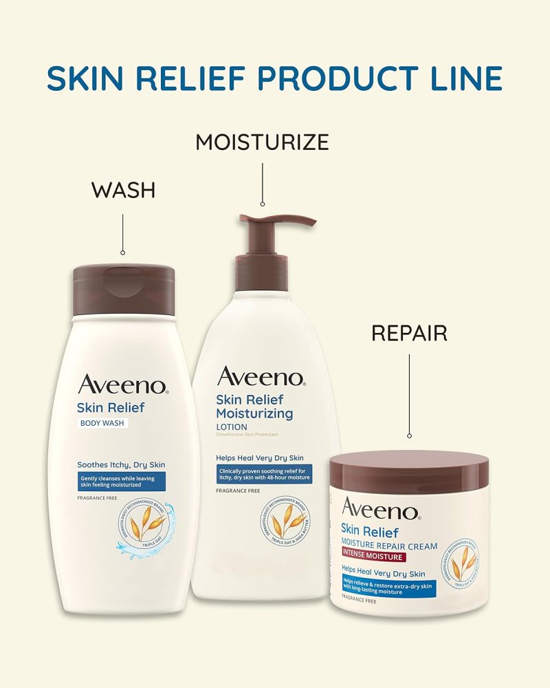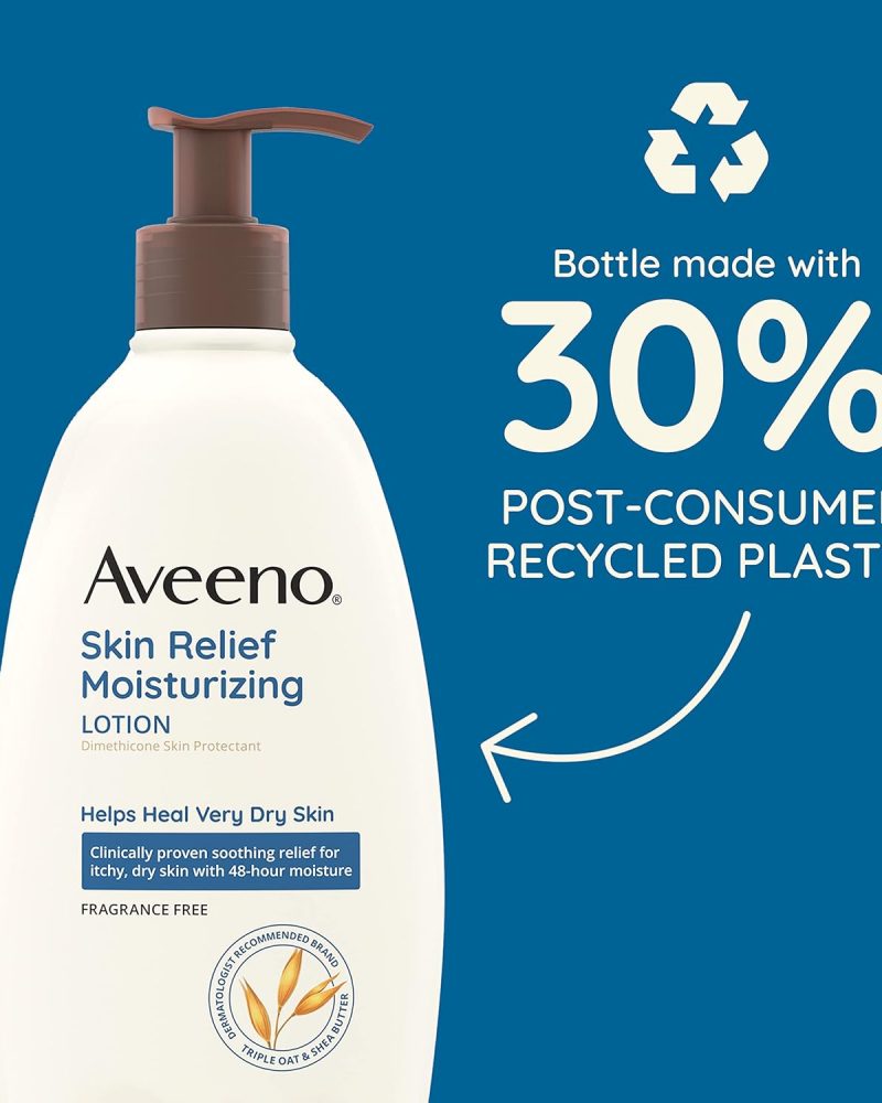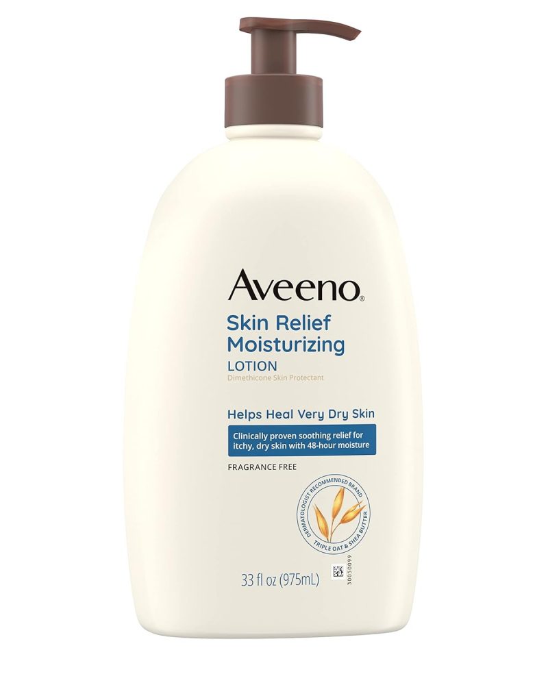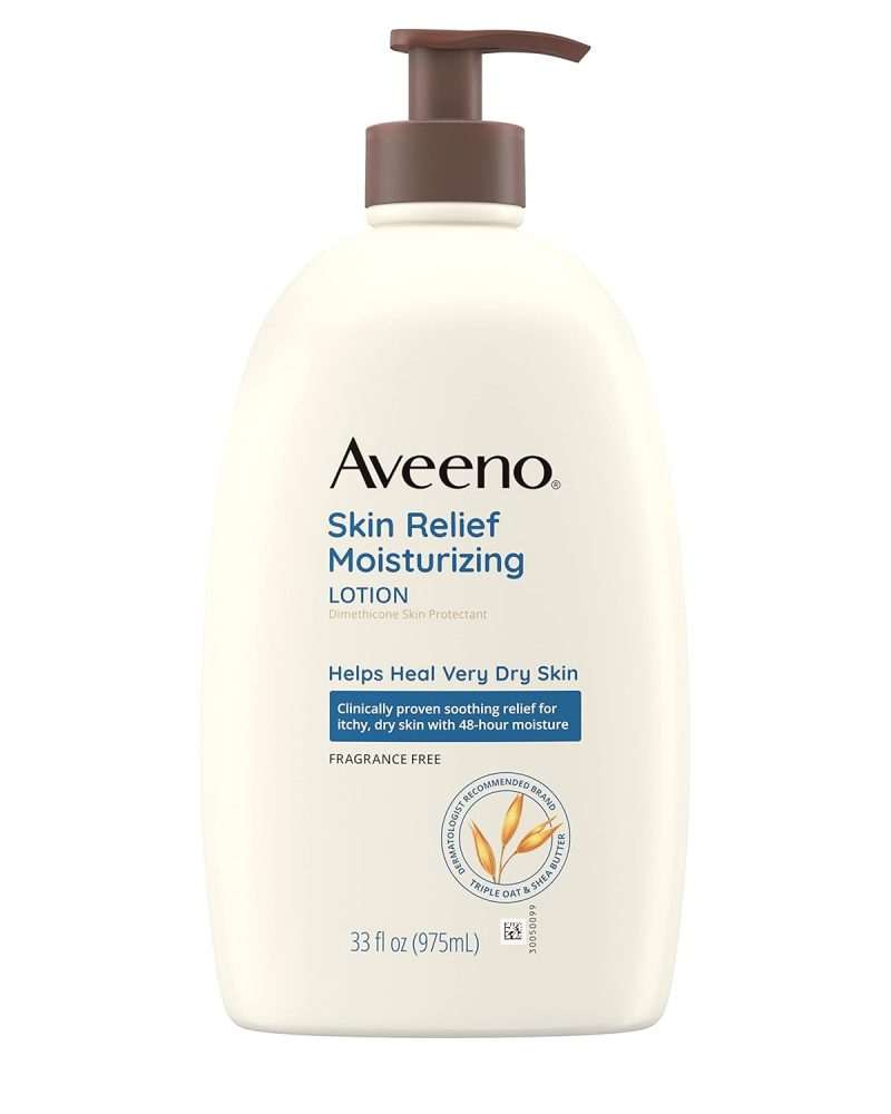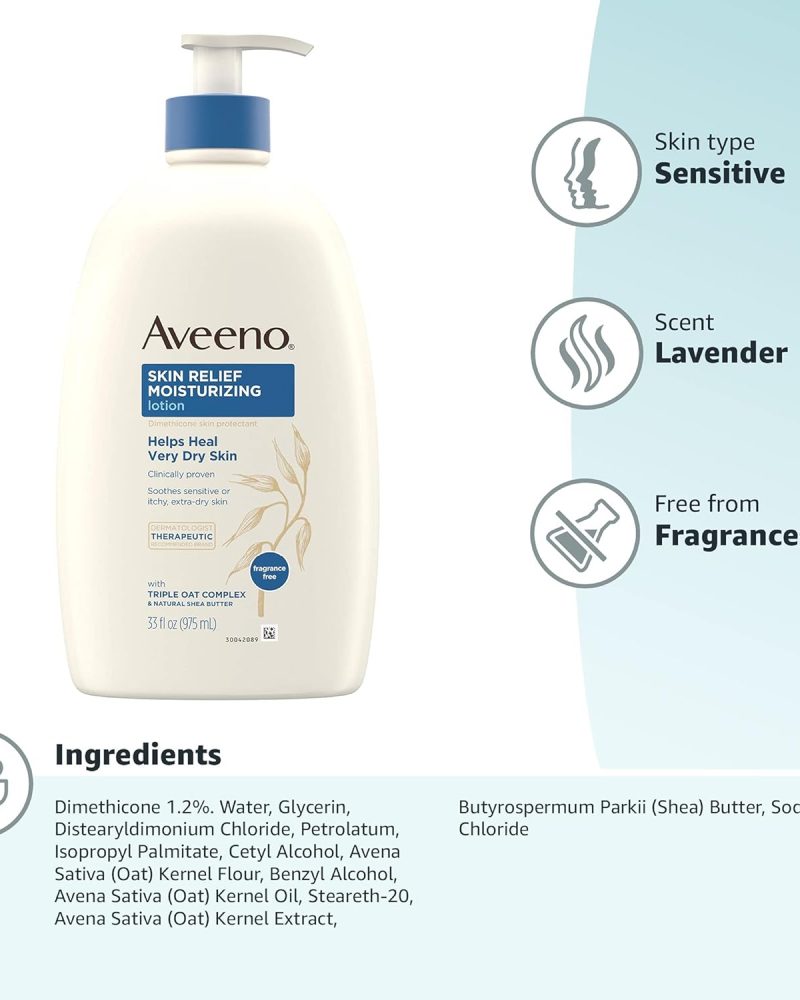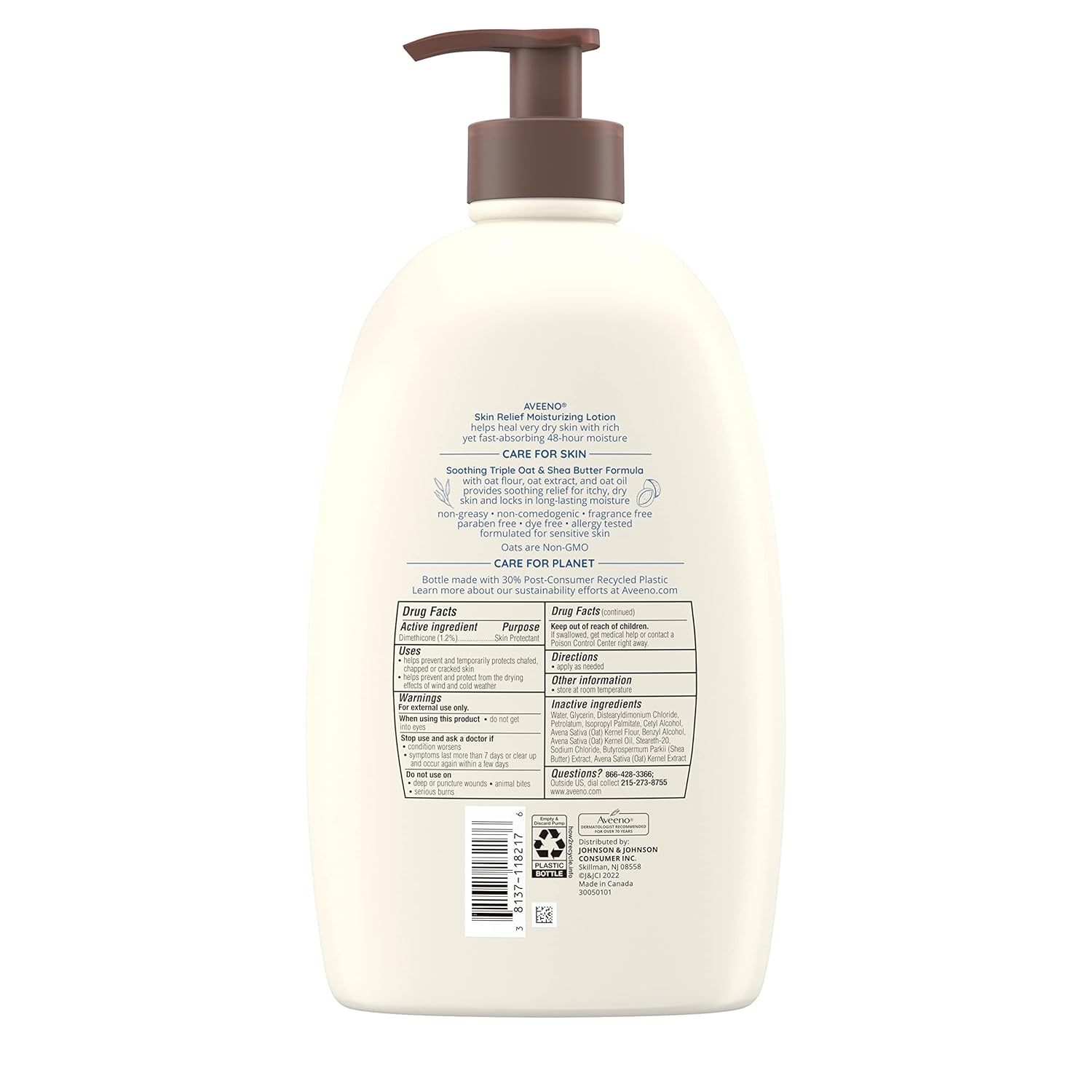 • 33-fluid ounces of Aveeno Skin Relief Fragrance-Free Moisturizing Body Lotion with a soothing triple oat and shea butter formula helps heal very dry skin and provides clinically proven relief for itchy, dry skin with 48-hour moisture