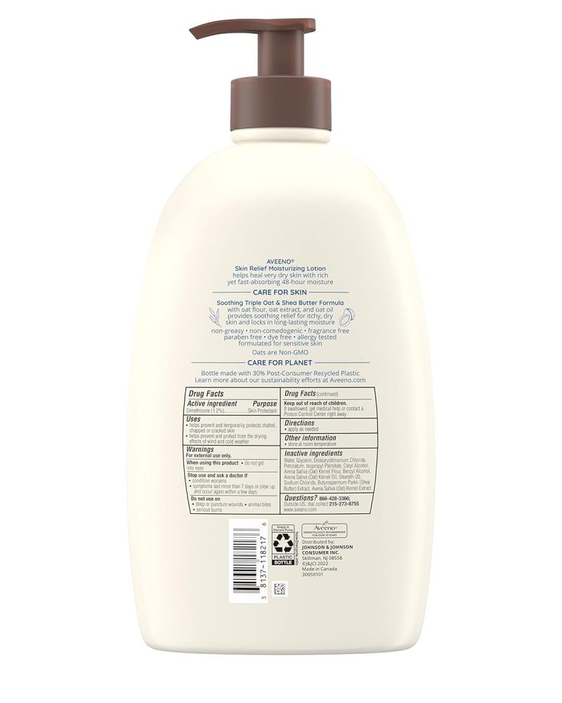 Aveeno Skin Relief Moisturizing Lotion for Very Dry Skin with Soothing Triple Oat & Shea Butter Formula, Dimethicone Skin Protectant Helps Heal Itchy, Dry Skin, Fragrance-Free, 33 fl. oz