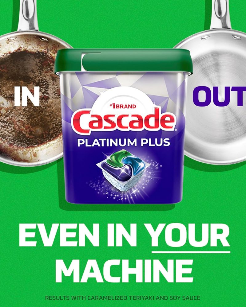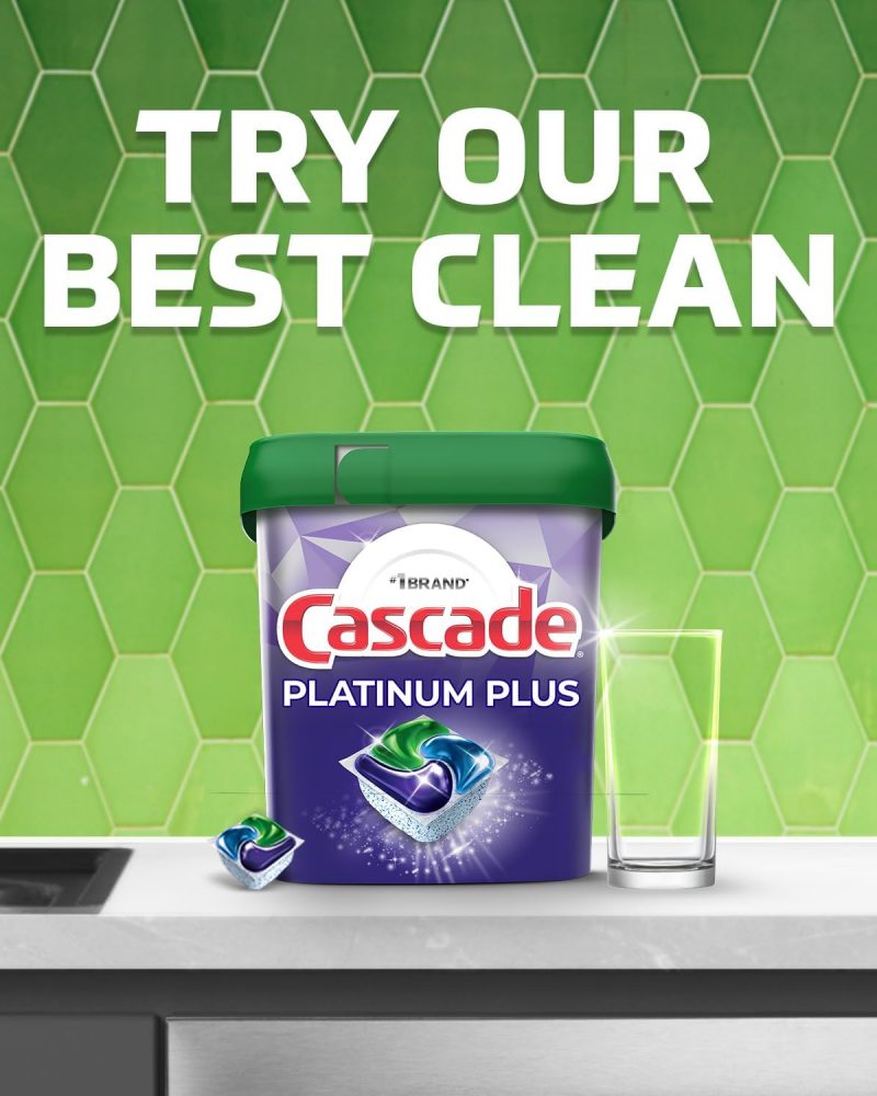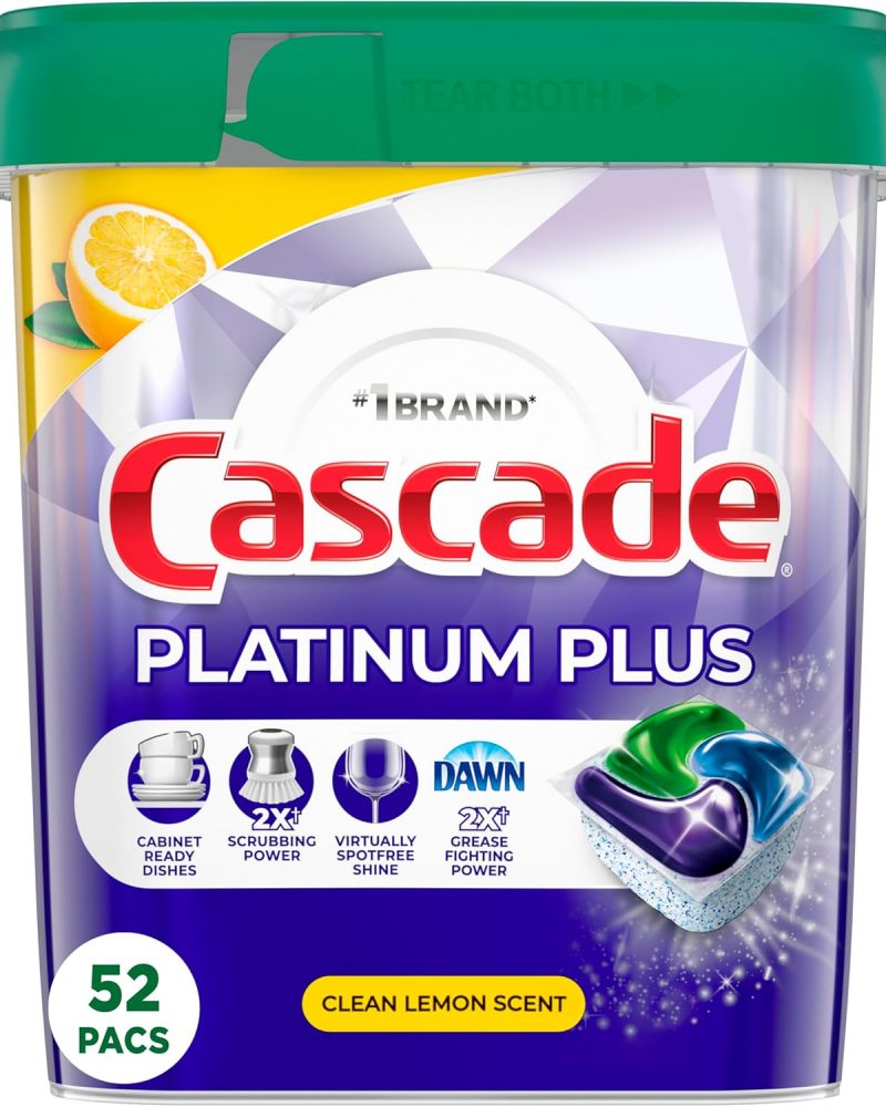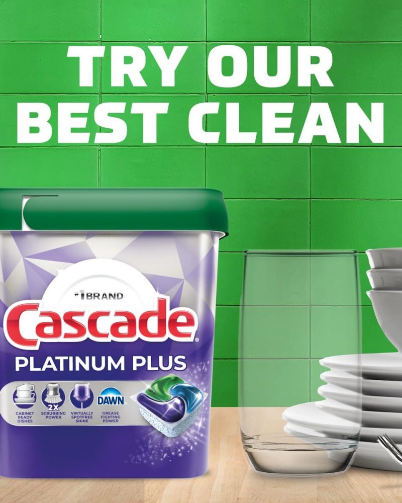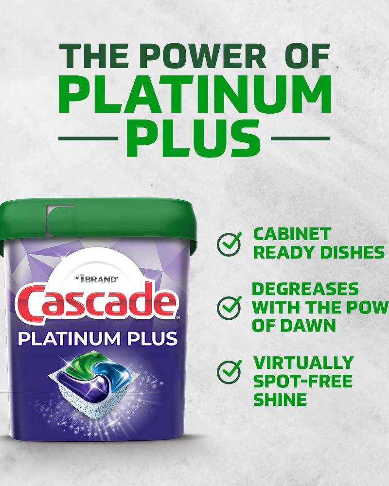 Cascade Platinum Plus ActionPacs dishwasher detergent gives your dishes a breakthrough, cabinet ready clean. Loaded with 2X* the Dawn grease fighting power, and 2X* the tough food scrubbers, it has soaking, scrubbing, and rinsing built right in. You can skip the pre-rinse, skip the soak, skip the scrub, and dare to dish differently. Just scrape your dishes and load them into your dishwasher with Platinum Plus to get a superior, sparkling clean, saving you time, effort, and energy vs handwashing. Get virtually spotfree gleaming glassware, dazzling dishes, and pristine pots and pans with Cascade Platinum Plus dishwashing ActionPacs. *Cleaning ingredients vs. Cascade Complete ActionPacs.
