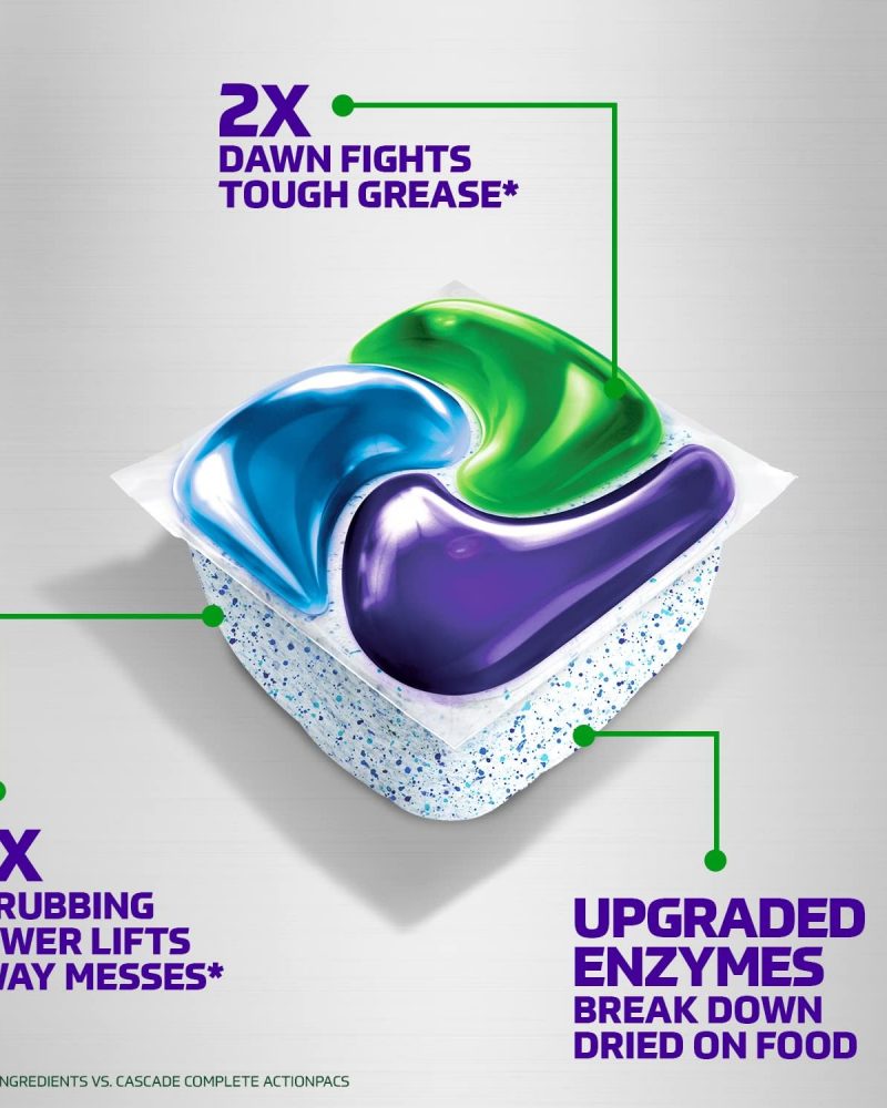 - Only Cascade Platinum Plus contains 2X* the Dawn grease fighting power and 2X* the scrubbing power to power through dried on food *Cleaning ingredients vs Cascade Complete ActionPacs