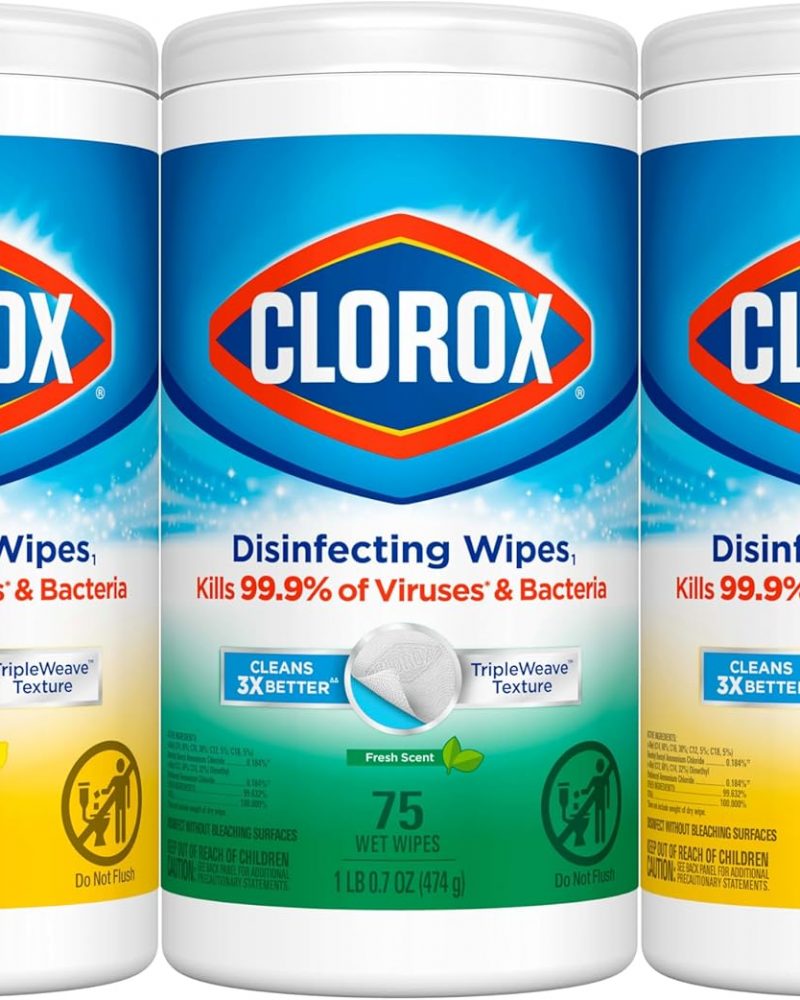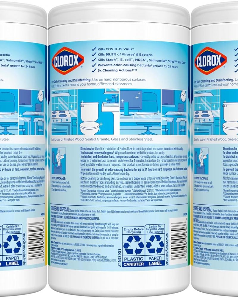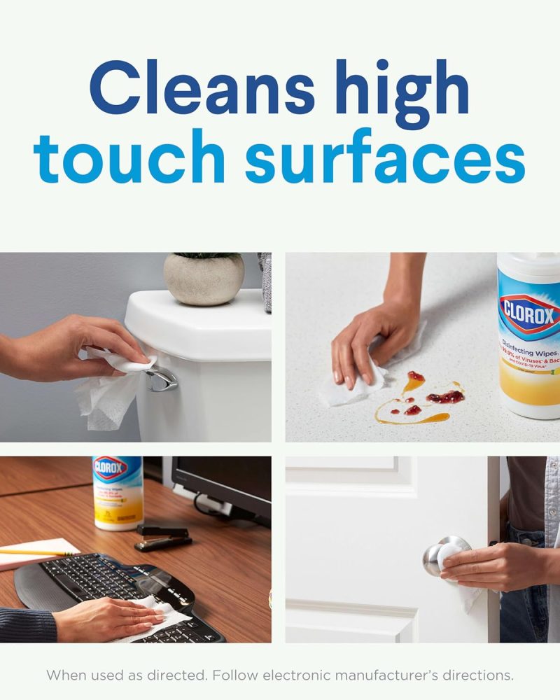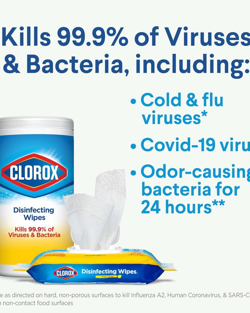 Clorox Disinfecting Wipes with TripleWeave texture kill germs, cleans tough messes and removes 99.9% of allergens on surfaces like kitchen counters bathroom surfaces and more. Disinfecting Wipes clean and disinfect with antibacterial power that kills 99.9% of viruses and bacteria that can live on surfaces, including COVID-19* Virus, staph, E. coli, MRSA, salmonella, strep and Kleb. These all-purpose disposable wipes can prevent the growth of bacteria* for up to 24 hours. Wipes are safe to use on finished wood, sealed granite and stainless steel. Clean with bleach-free wipes to keep dirt and germs away. Do not flush. * Kills COVID-19 virus: kills SARS-CoV-2 on hard, nonporous surfaces. Use as directed. Vs. a paper towel. Prevents the growth of bacteria: odor causing bacteria on non-food contact surfaces. Allow product to air dry.