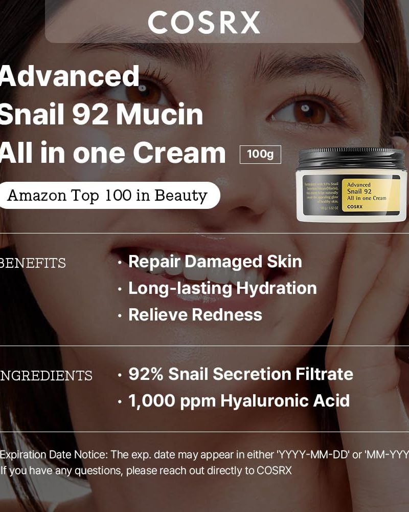 • Daily Repairing Cream: Infused with 92% of Snail Mucin (Snail Secretion Filtrate), this cream builds a moisture barrier to plump, hydrate, and soothes skin. This everyday multi-solution cream glides onto the skin and revives skin radiance without leaving a sticky residue.