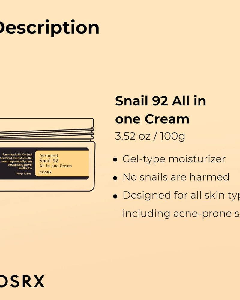 Be the first to review “COSRX Snail Mucin 92% Repair Cream, Daily Face Gel Moisturizer for Dry Skin, Acne-prone, Sensitive Skin, Not Tested on Animals, No Parabens, Korean Skin Care 3.52 Fl Oz (Pack of 1)”