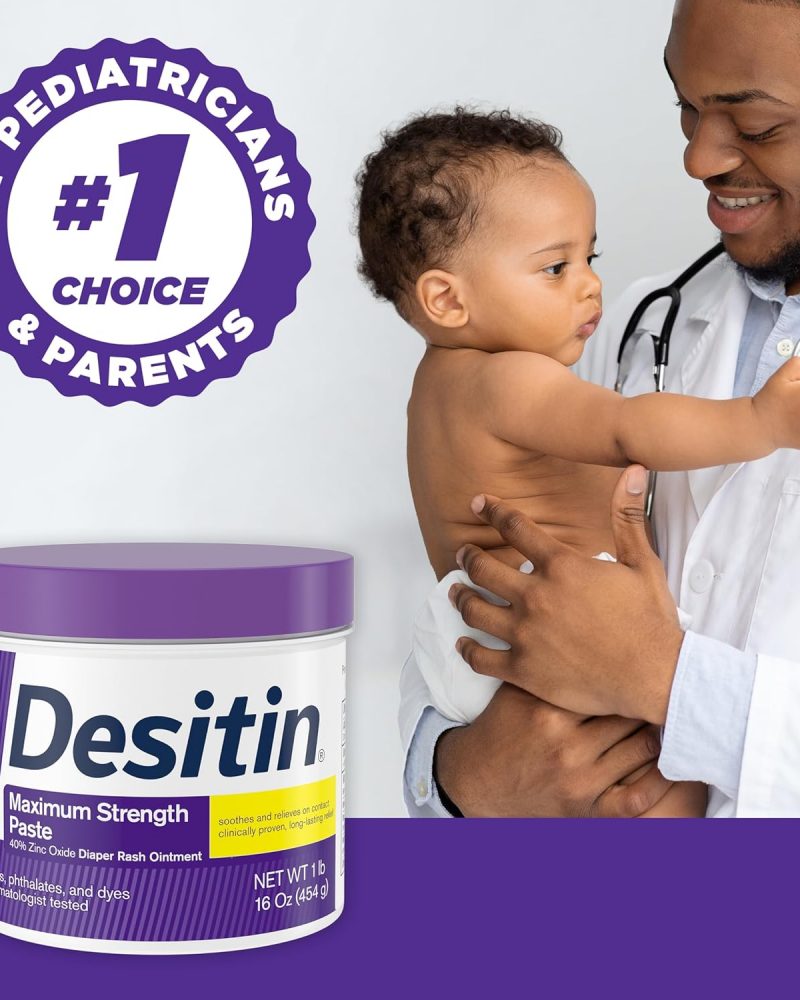 The #1 choice of pediatricians and parents, Desitin Maximum Strength Diaper Rash Paste works to effectively treat and help prevent diaper rash discomfort. Made with 40% maximum-level zinc oxide, this rich, thick diaper rash cream soothes and relieves on contact by sealing out wetness and protecting chafed skin due to diaper rash. Dermatologist- and pediatrician-tested, it is clinically shown to protect baby’s delicate skin for 12 hours. The hypoallergenic formula of this diaper rash treatment is gentle enough for daily use and is free of parabens, phthalates, dyes, and soap. Desitin Maximum Strength Diaper Rash Paste provides 5-in-1 action to treat, heal, protect, soothe and prevent diaper rash, for healing you can see and relief your baby can feel.