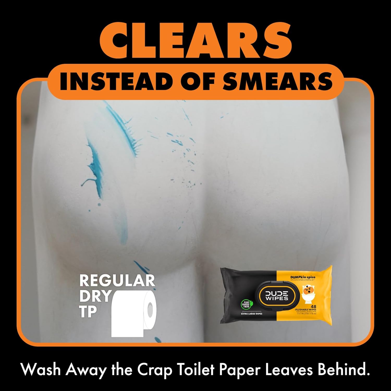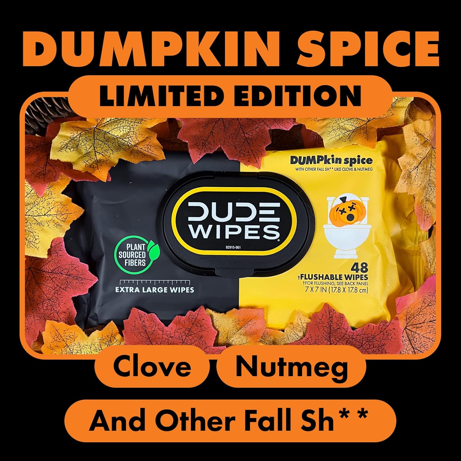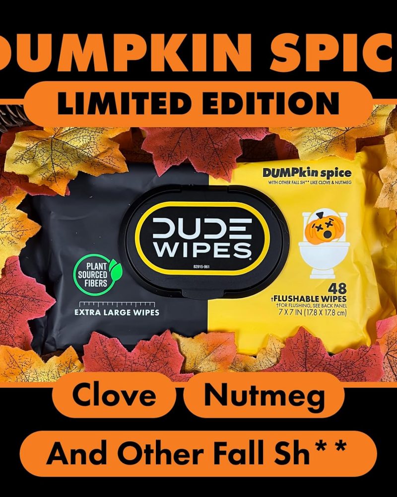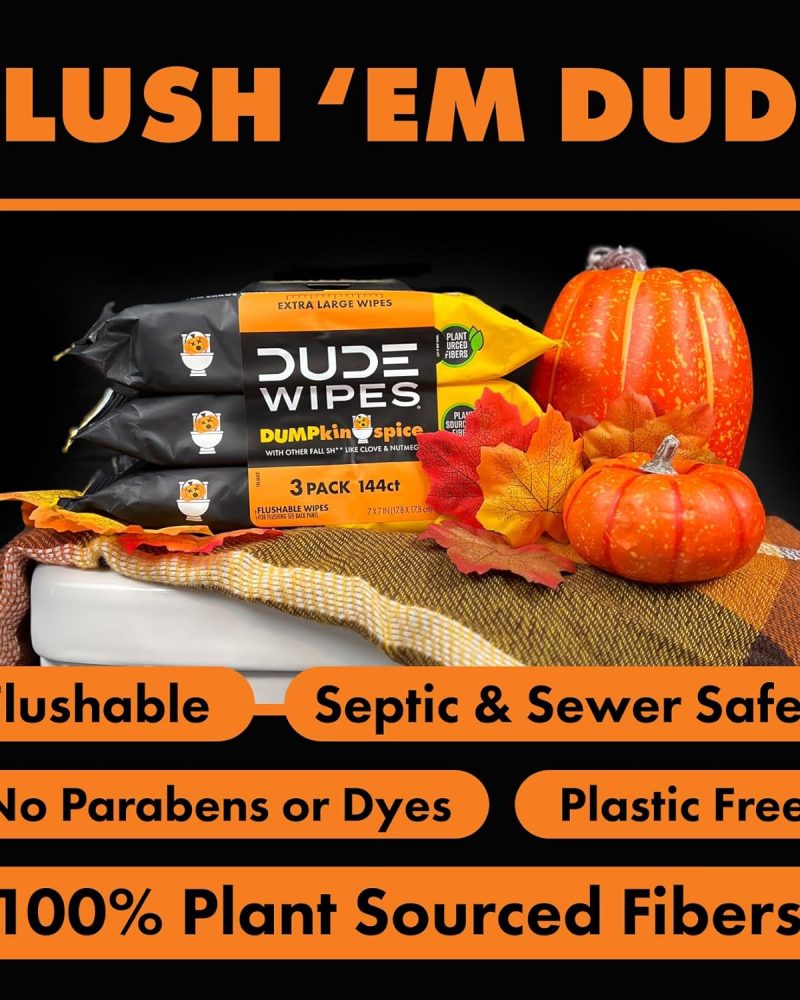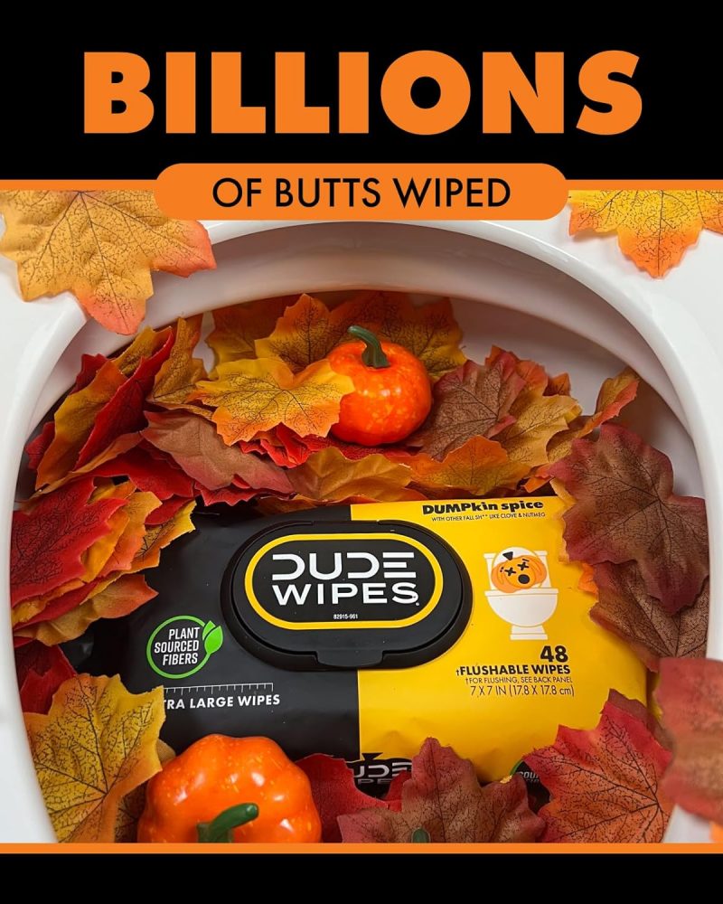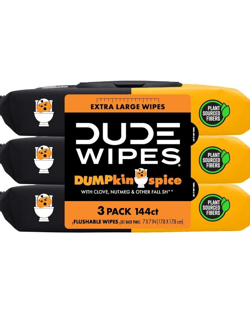 Send toilet paper back to the Stone Age where it belongs! DUDE Wipes DUMPkin Spice Flushable Wipes keep your butt cozy with a pumpkin spice-inspired mix of clove, nutmeg, and other fall scents. Made with 99% water and plant-based ingredients, our butt wipes are gentle on your skin and formulated for a more refreshing feeling than toilet paper. So go ahead and tell your friends: you officially have the freshest butt in the game. When it comes to flushable wet wipes, size matters. Good thing we’re big (because nobody wants a little wipe after a big burrito). Our flushable wipes are made with plastic-free and plant-sourced fibers to help protect both the planet and your pipes, and they are free of fragrances, parabens, phthalates, and a bunch of other words that are really hard to spell. Unlike baby wipes, DUDE Wipes begin to break down once flushed, making them sewer-safe and septic-safe. Plus, our plush wet wipes come in sleek dispenser packs that fit perfectly on your throne. So, just sit back, relax, and take in the sweet smell of those herbs, DUDE.