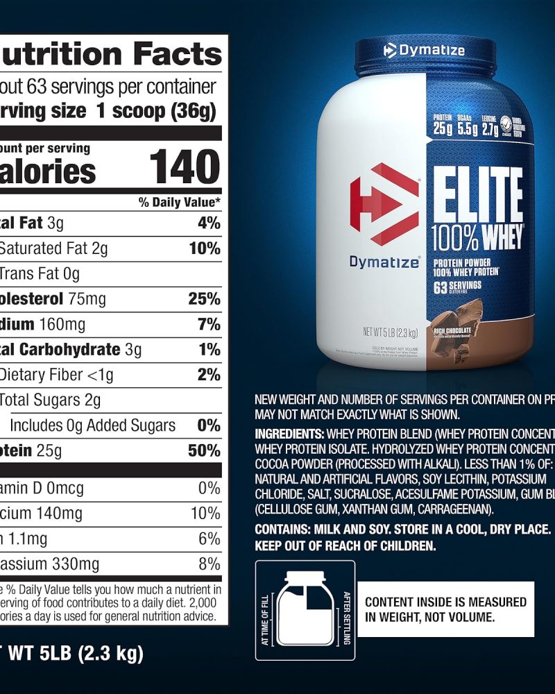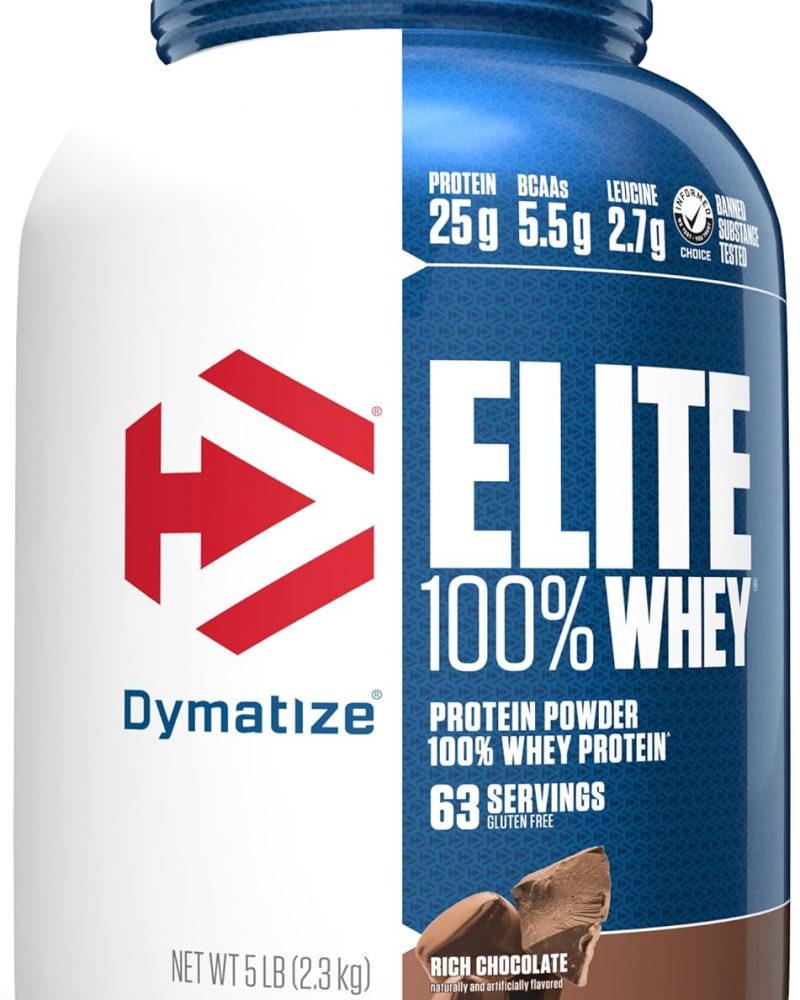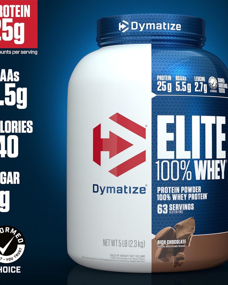- Dymatize Elite 100% Whey Protein Powder, 25g Protein, 5.5g BCAAs & 2.7g L-Leucine, Quick Absorbing & Fast Digesting for Optimal Muscle Recovery, Rich Chocolate, 5 Pound, 63 Servings