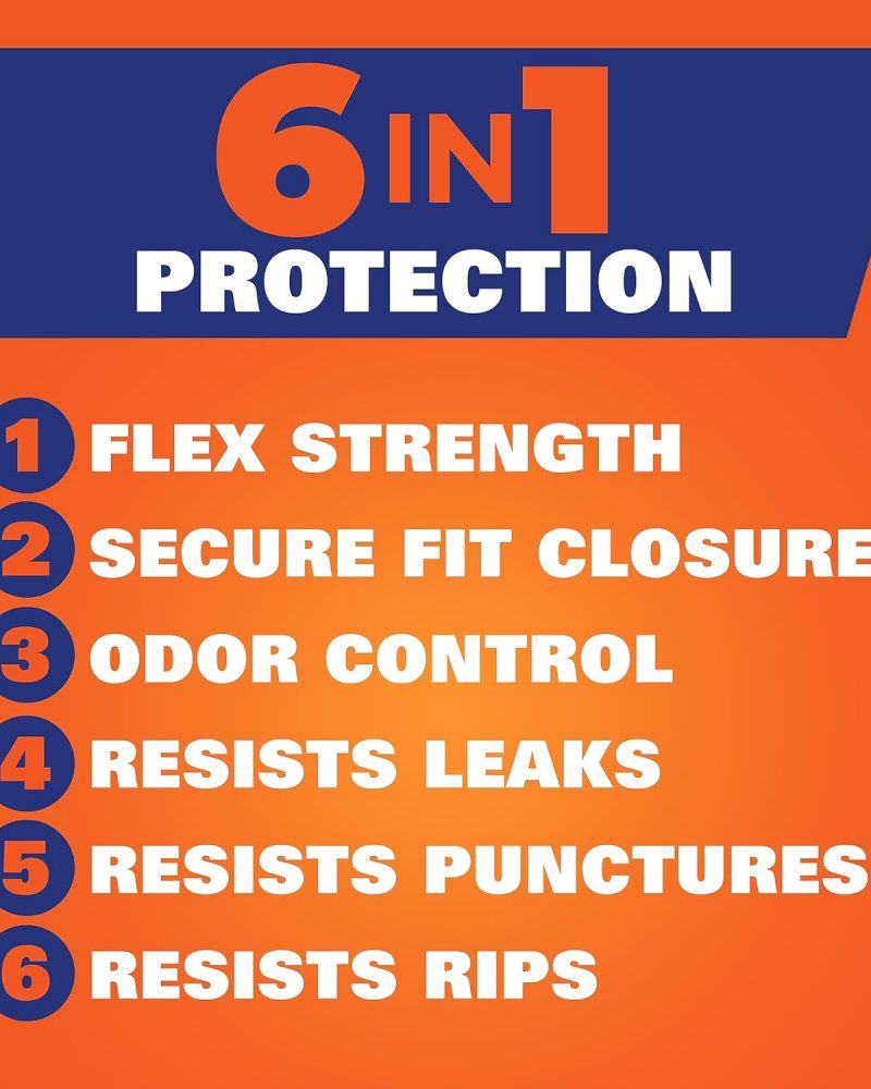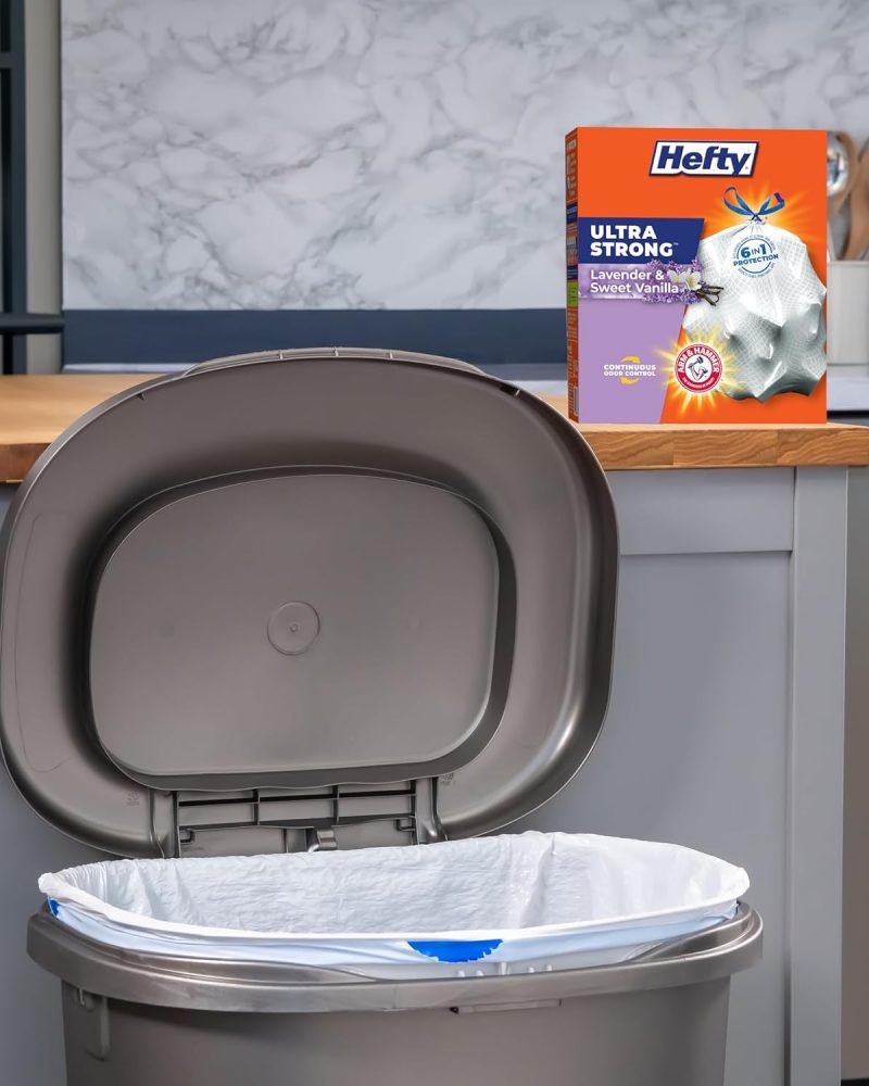 Trust Hefty Ultra Strong 13 Gallon Trash Bags to keep your kitchen waste contained—all the way from the can to the curb. Thanks to Triple-Action Technology, these tough Hefty 13 gallon trash bags resist punctures, leaks, and tears, providing the highest protection available in flexible garbage bags. That stretchy strength means you don’t have to worry about unexpected bag breakage and inconvenient messes when you use these tall trash bags. Don’t be afraid to use these kitchen trash bags for tougher jobs, such as garage, basement and construction cleanup. A break-resistant grip drawstring makes it easy to close the bag and cart it away without incident. As a bonus, these scented trash bags include a patented Arm and Hammer odor neutralizer and Lavender and Sweet Vanilla scent to keep unpleasant smells at bay. All Hefty trash bags are backed by a 100% Satisfaction Guarantee. *The ARM & HAMMER trademark is owned by Church & Dwight Co., Inc., and used by Reynolds Consumer Products LLC under license.