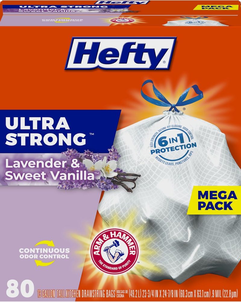 - 13 Gallon Garbage Bags—This package contains 80 Hefty Ultra Strong 13 Gallon Trash Bags in White, Lavender and Sweet Vanilla Scent
