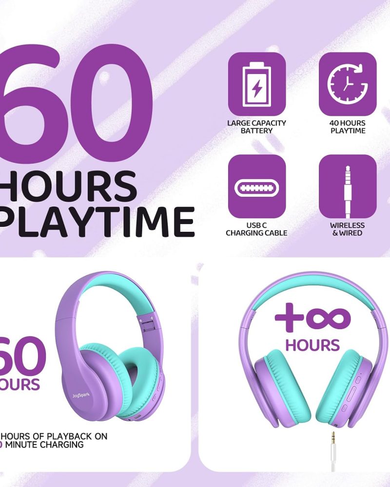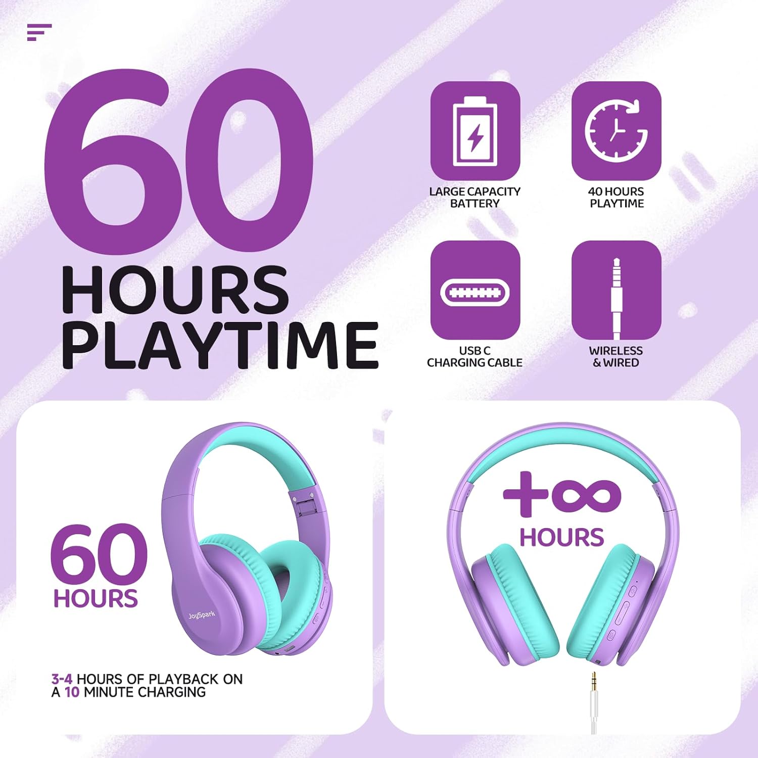 - 【Hours of Uninterrupted Listening】- Enjoy extended listening sessions with up to 60 hours of music, study, movies, and calls on a single charge. The JoySpark kids headphones also feature a 3.5mm backup jack, ensuring uninterrupted enjoyment with JoySpark headphones for kids.