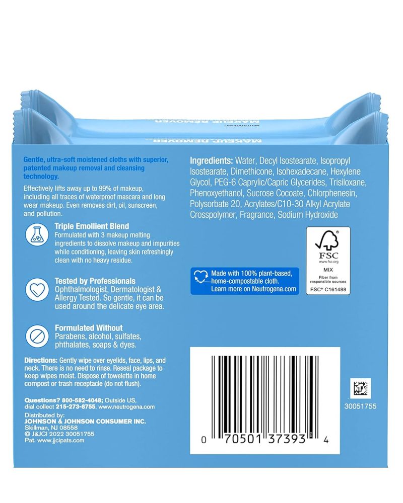 Remove makeup in one easy step with Neutrogena Makeup Remover Face Wipes. These soft and gentle pre-moistened facial cleansing towelettes effectively dissolve all traces of dirt, oil and makeup–even waterproof mascara– for clean, fresh looking skin every day. Our makeup remover features an effective micellar-infused, triple emollient formula that leaves skin feeling refreshed, nourished, conditioned and thoroughly clean with no heavy residue. These facial towelettes also remove sweat, sunscreen, and pollution from skin with no need to rinse after use. These daily face wipes are formulated to be gentle on the sensitive eye area. The makeup removing wet wipes are formulated without phthalates, parabens, sulfates, alcohols, soaps, or dyes and are ophthalmologist-, dermatologist-, and allergy-tested. Designed with the earth in mind, the compostable wipes are made with 100% plant-based fibers and biodegrade in 35 days in home compost.