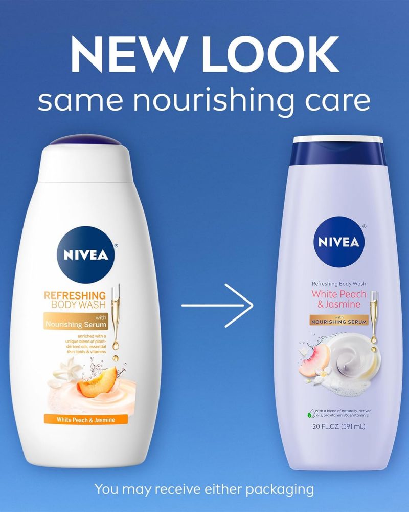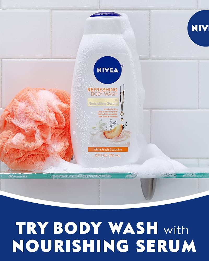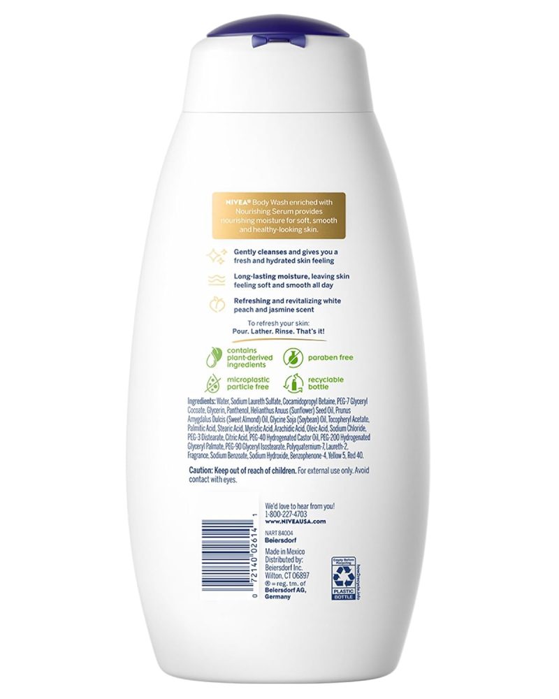 • Includes one (1) 20 fluid ounce bottle of NIVEA White Peach and Jasmine Body Wash with Nourishing Serum