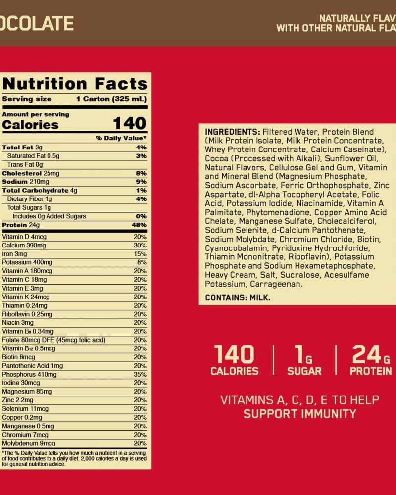 Optimum Nutrition’s Gold Standard Protein Shake is 24 grams of high-quality protein and 24 essential vitamins and minerals that you can enjoy to start your day, in between meals as an anytime snack, before or after activity, and/or before bed with no mixing, shaking, or blending required. This easy, on- the-go shake comes in delicious chocolate and vanilla flavors, with zero added sugars and only 1 total gram of sugar. Gold Standard Protein Shake helps healthy adults and active individuals reach daily protein requirements, providing the fuel needed to recover from whatever your day throws your way.