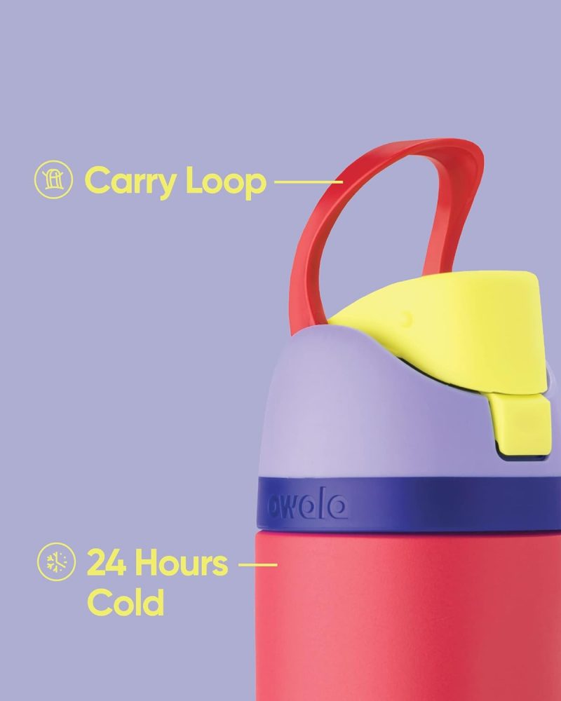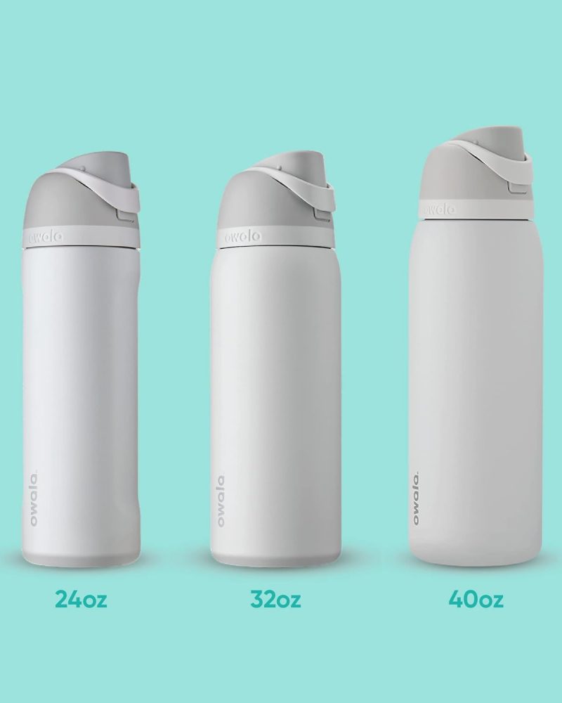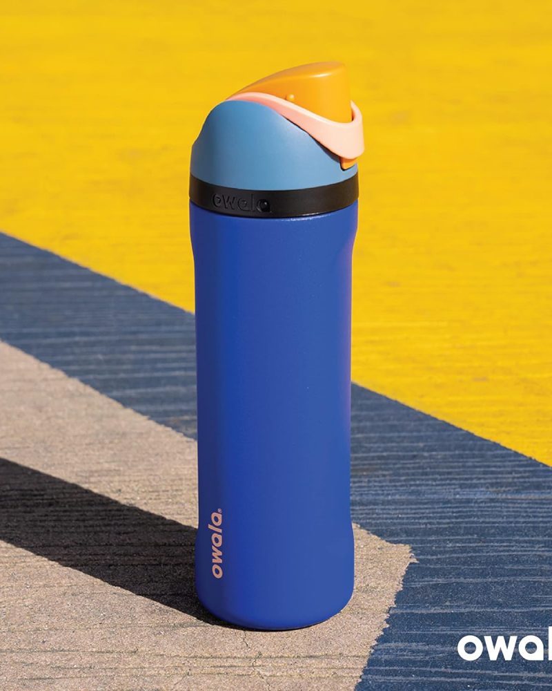 The Owala FreeSip Insulated Stainless-Steel Water Bottle with Locking Push-Button Lid easily tackles every thirst. With a built-in, easy-clean straw and a wide-mouth opening, the FreeSip reusable bottle is designed for drinking two different ways: sipping upright through the straw or tilting back to swig from the wide-mouth spout opening. Add in a push-to-open lid and playful colors, and staying hydrated has never been simpler—or more fun. Additional features include double-wall insulated stainless steel that keeps drinks cold up to 24 hours, a carry loop that doubles as a lock, and a wide opening for easy cleaning and adding ice. The Owala FreeSip Insulated Stainless-Steel Water Bottle with Locking Push-Button Lid is available in three sizes: 24-Ounce, 32-Ounce, and 40-Ounce. Lid is dishwasher safe; hand wash cup. Not for use with hot liquids. Manufacturer’s limited lifetime warranty.