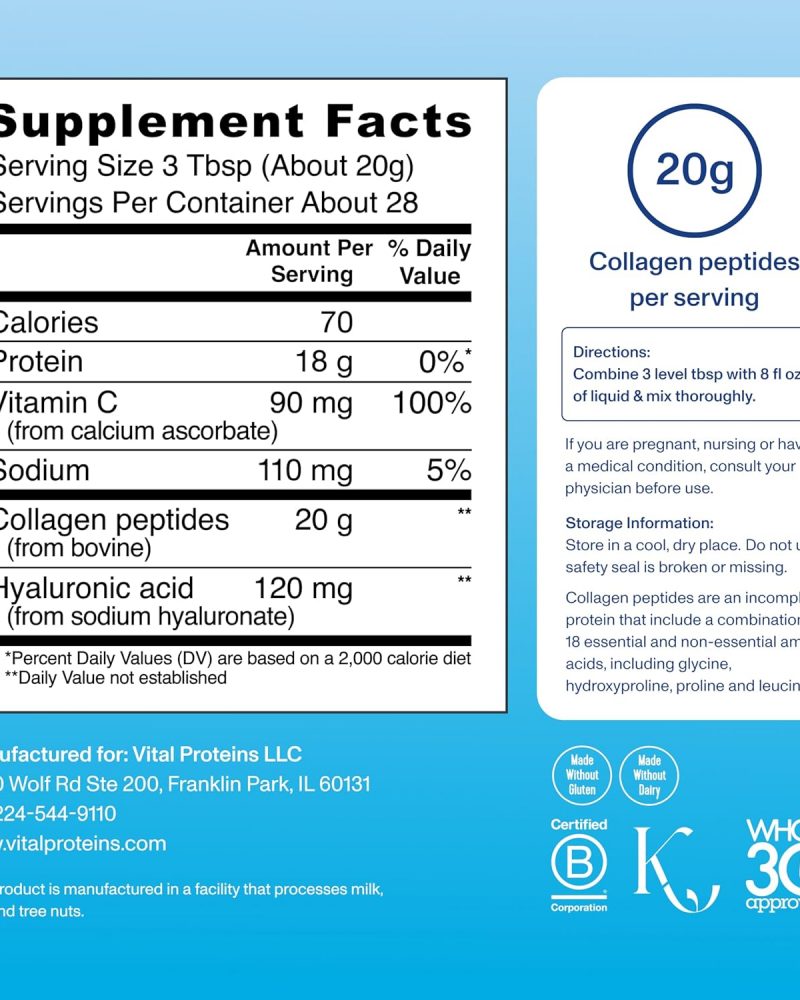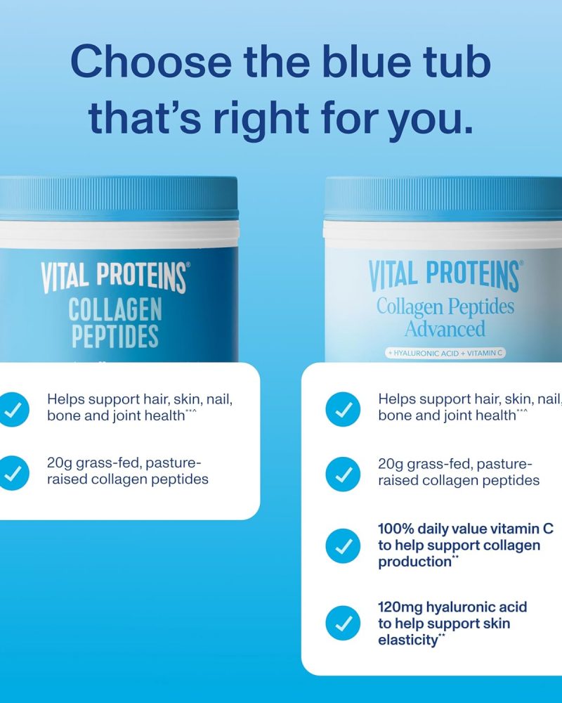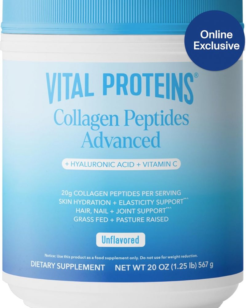- Vital Proteins Collagen Peptides Advanced is a premium offering, with 20g Collagen Peptides per serving plus two additional functional ingredients – 100% daily value Vitamin C and 120mg Hyaluronic Acid
