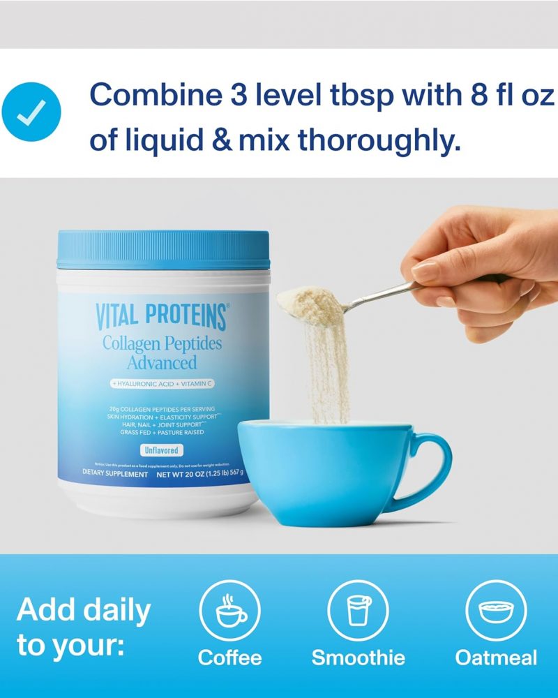- Easy To Use: One serving a day of Vital Proteins Collagen Peptides Advanced is easily digested and dissolves in cold or hot liquids, like coffee, tea and smoothies.