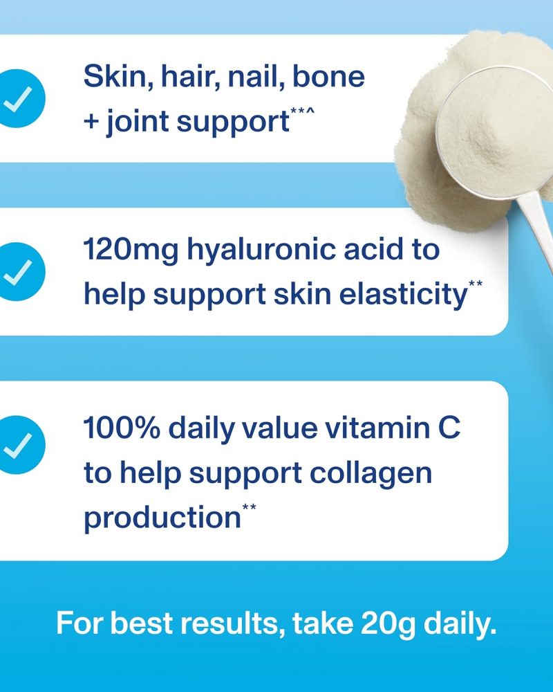 - Vitamin C helps to support the body’s natural collagen production while Hyaluronic Acid helps to improve skin hydration and joint mobility.**^
