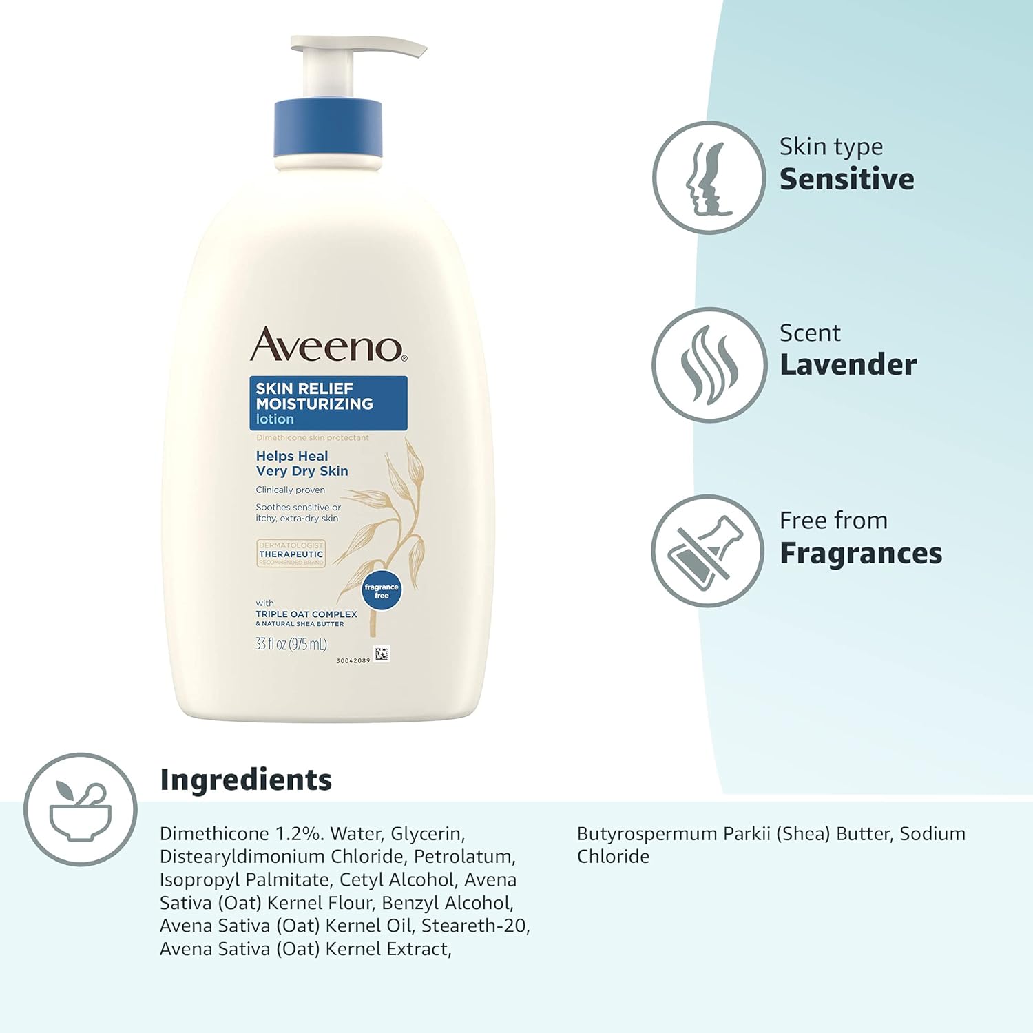 Aveeno Skin Relief Moisturizing Lotion for Very Dry Skin with Soothing Triple Oat & Shea Butter Formula, Dimethicone Skin Protectant Helps Heal Itchy, Dry Skin, Fragrance-Free, 33 fl. oz